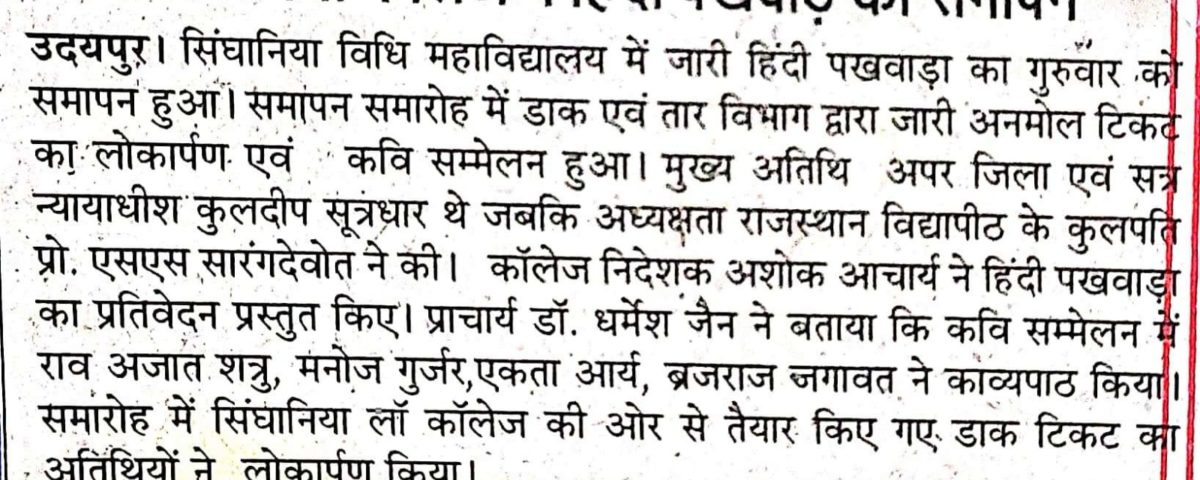 The closing ceremony of “Rajbhasha Pakhwada” was organized by Singhania Law College, Udaipur on 30/09/2021. Prof. Colonel S. S. Sarangdevot, Vice-Chancellor, Janardan Rai Nagar Rajasthan Vidyapeeth, Udaipur Rajasthan was the chief guest on this occasion and the program was presided over by Justice Kuldeep Sutrakar, Secretary, District Legal Services Authority On this occasion ‘Post Stamp’ on the name of Singhania Law College issued by the Postal Department of the Government of India was released. On this occasion, the famous poet Shri Rao Ajatashatru recited three excellent poems on the subject of Hindi. Humor poetry and Veer Ras poems were read by other poets like Ekta Arya, Shri Manoj Gurjar, Shri Brajraj also senior journalist Shri Ugrasen Rao also talked about saving the Hindi language.